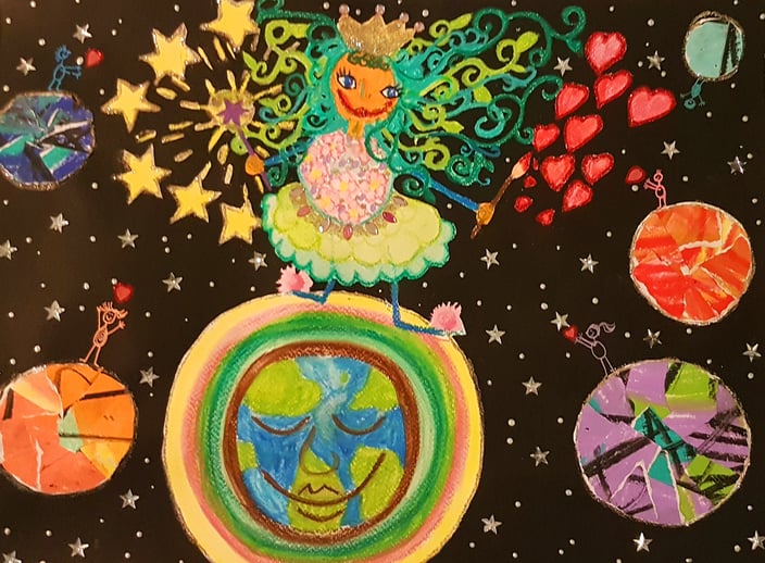 Dass dieses Malen für meine Seele heilsam war, hatte ich intuitiv zwar schon gefühlt, doch bewusst ist es mit erst während meinerer Ausbildung zur integraltherapeutischen Kunstpädagogin geworden. In dieser Zeit entstand auch das Bild, das Sie hier sehen. es zeigt mich mit vier Jahren, als ich das Malen und damit meine eigene Schöpferkraft gerade entdeckt hatte.